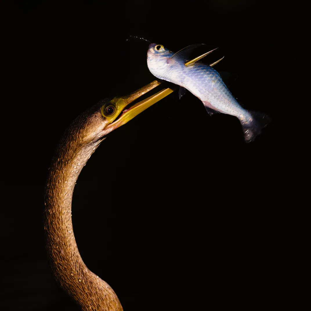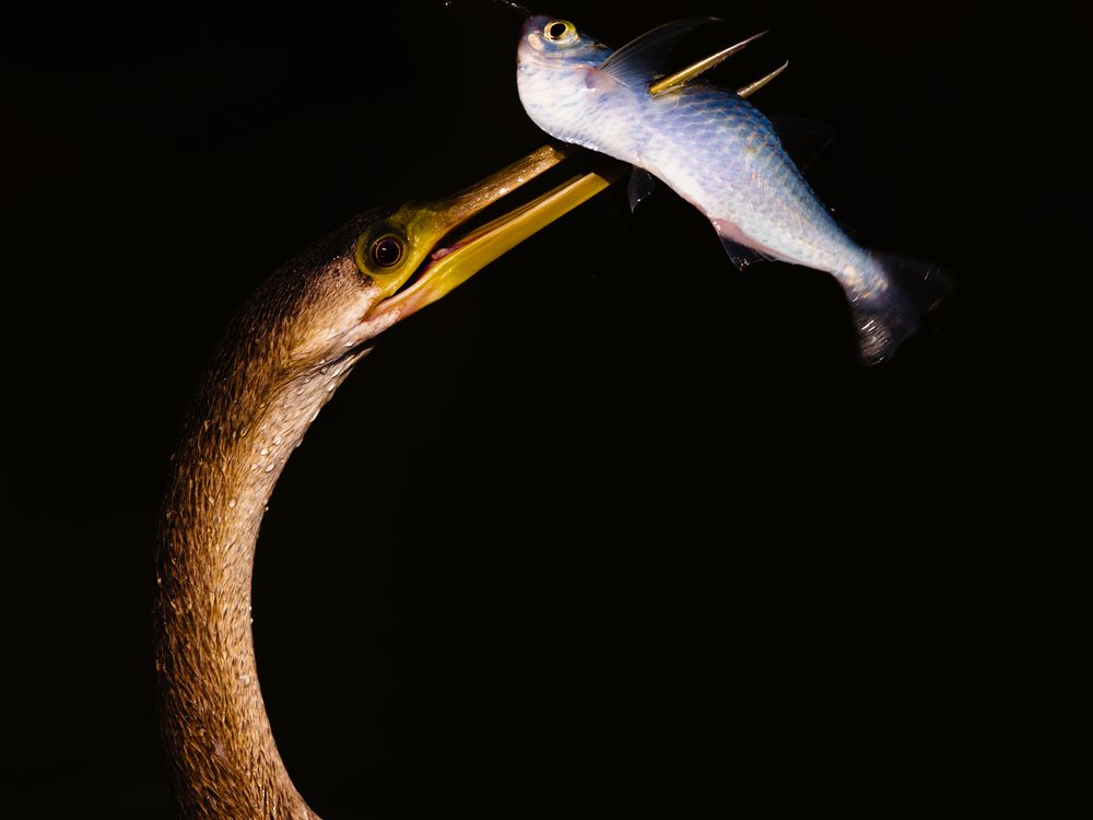 Having speared a small fish, an anhinga bursts through the water’s surface in Brazil’s Pantanal wetland. The evening sun paints its neck in molten gold, perfectly offsetting the silver shimmer of its catch. Dark waters, shaded by overgrowing vegetation, form a deep, contrasting background.