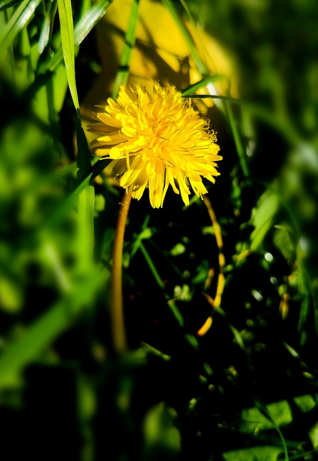 A dandelion standing bright among wild grass, showing resilience in its fragile form.