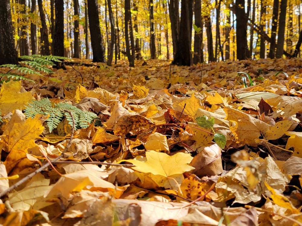 A low-to-the-ground view of bright yellow leaves blanketing the forest floor, with more golden foliage glowing on the trees in the background.