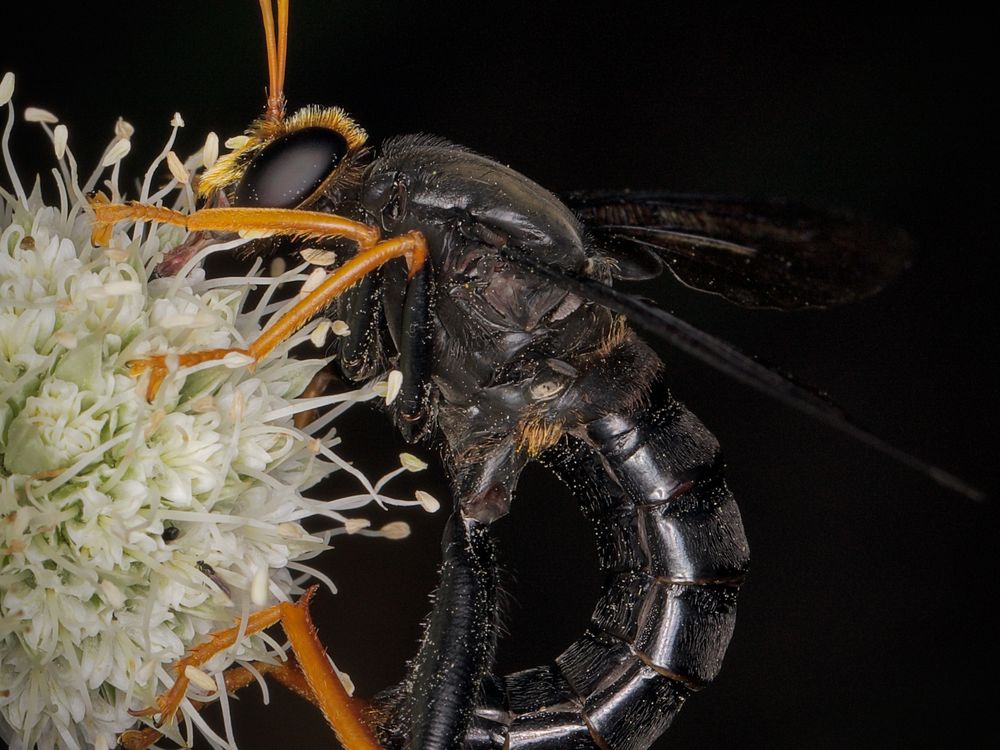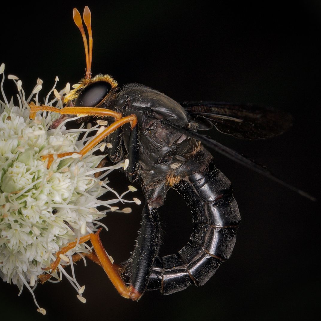 An evolved bluffer, this uncommon, large, yet harmless vegan fly looks like an intimidating carnivorous wasp, and acts like one, shrugging-away intrusions, even by territorial, true wasps. If tested, this mimic would fail, however, testing is not worth risk for most adversaries. This fly has a wingspan of approximately 5cm (2”).