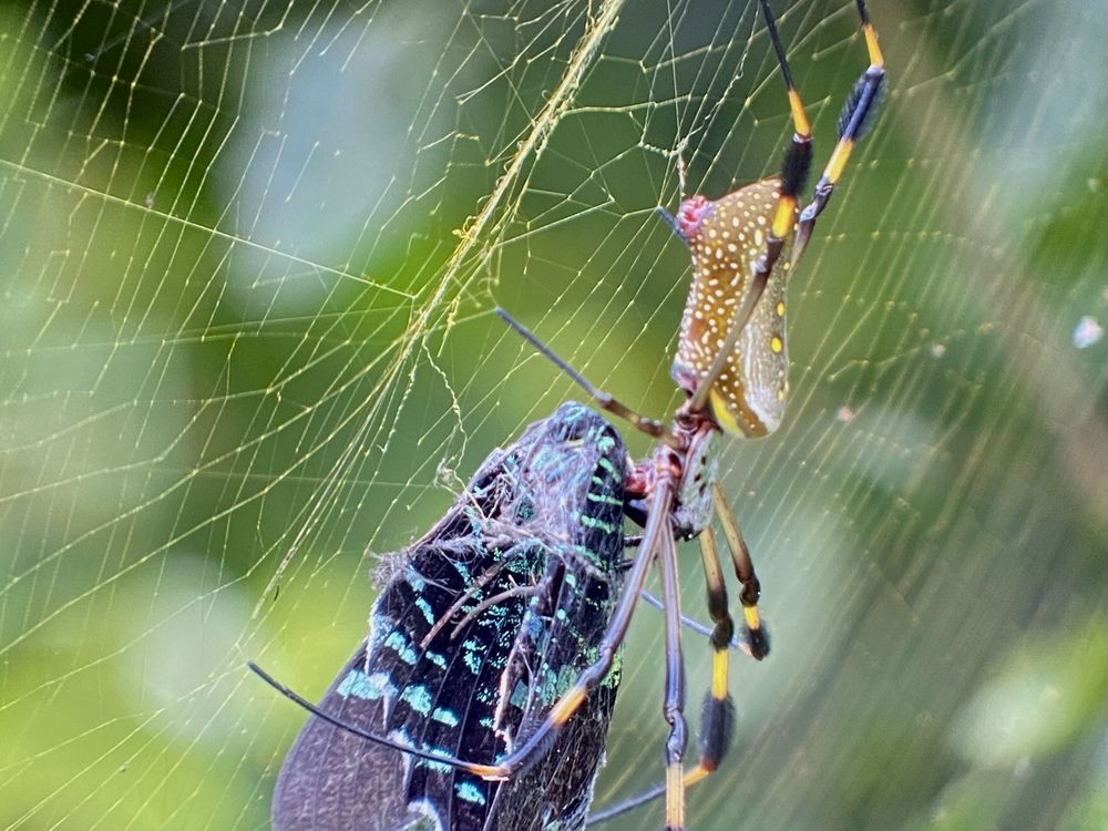This photo is one I took with my iPhone on a study abroad to Costa Rica. On a mission to study the nature in Costa Rica, we were out searching for critters in the remote town of Mastatal (a population of about 150 people). I stumbled upon this golden orb spider snacking on a cicada, which is a bright teal color there, and got this snapshot. The spiders are giant, almost the size of my hand, making its detail in the image striking.