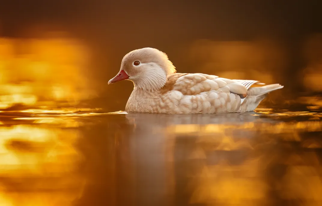 This photograph captures an exceptionally rare leucistic female mandarin duck with partial pigmentation loss.