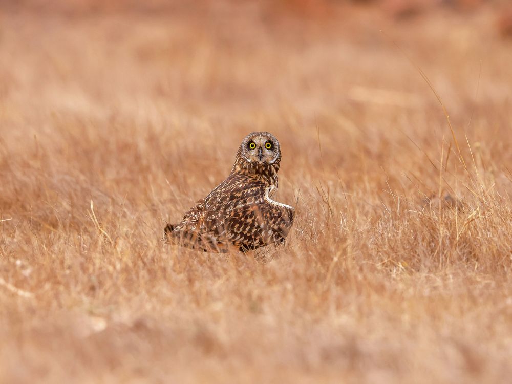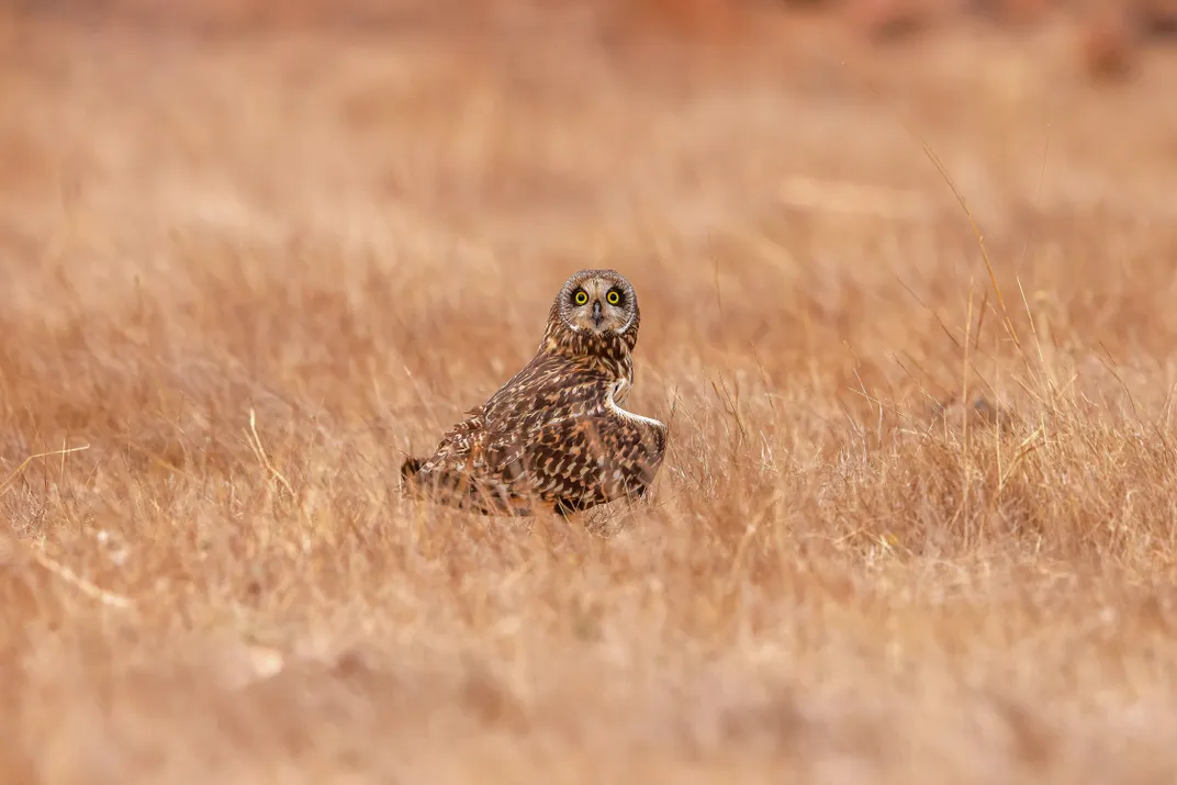 Camouflage in the Grass. A Short-eared Owl is perfectly camouflaged in the dry, golden grasses of a field. This owl species is known for being active during the day (diurnal) or at dusk (crepuscular), often hunting low over open land.