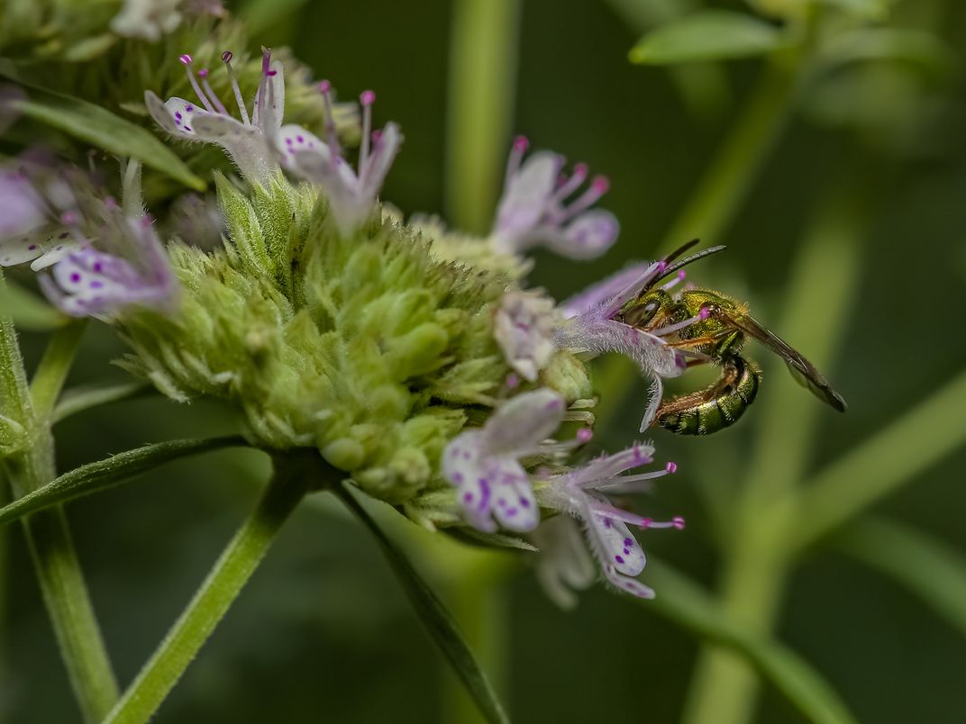 A Golden Sweat Bee curls into a floret of Mountain Mint collecting pollen. Less than a centimeter away beneath the bee, a set of legs poke out from between the florets.