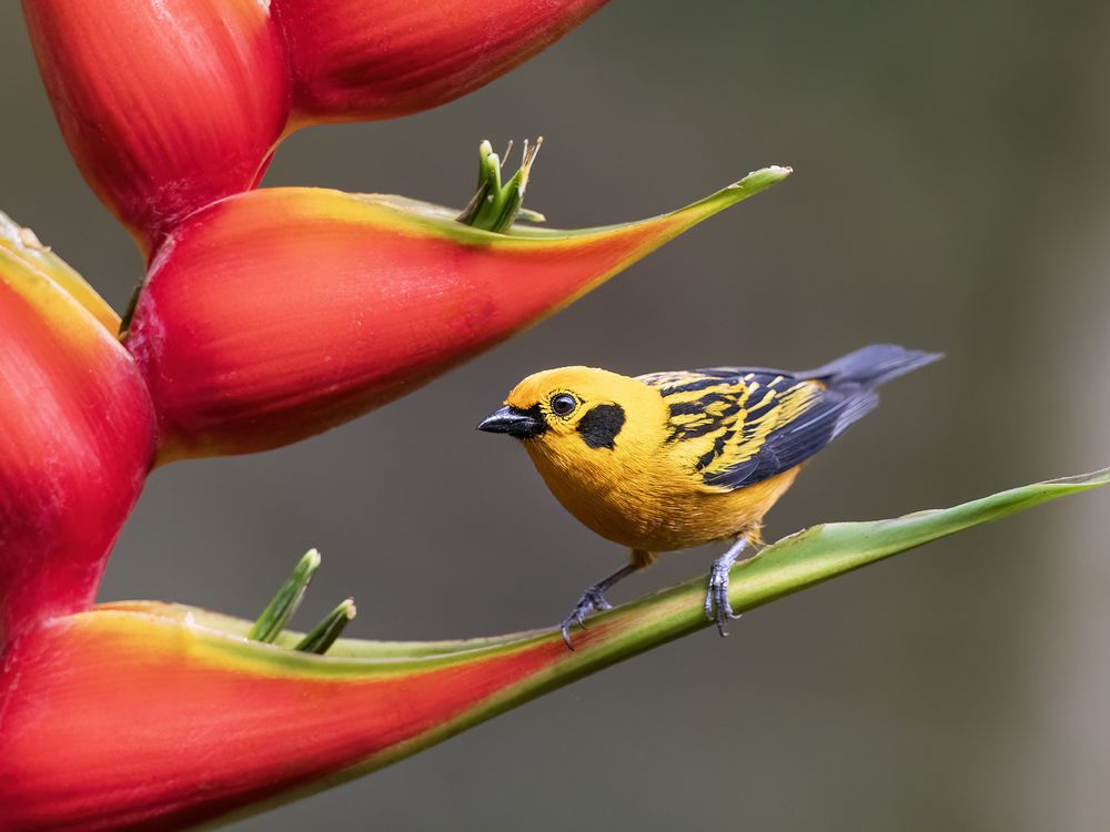 Golden Tanager and Heliconia Flowers