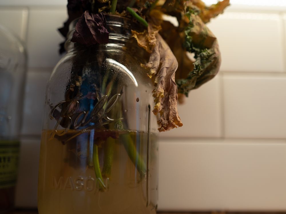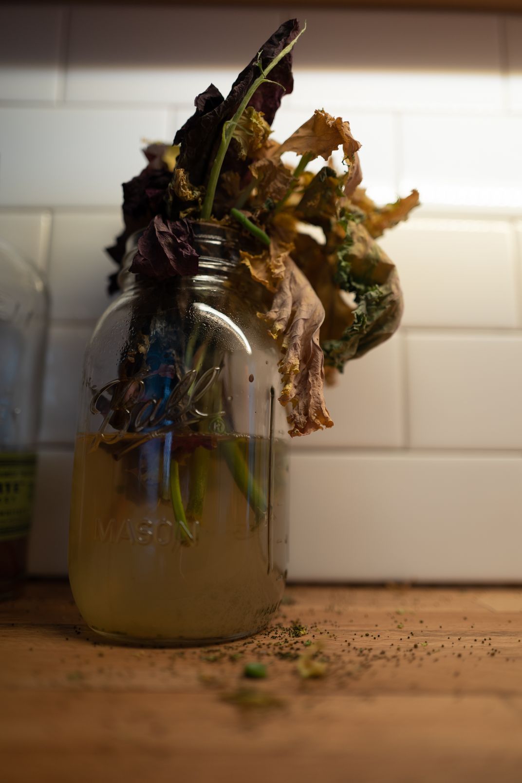 Neglected lettuce on the counter has gone to seed.