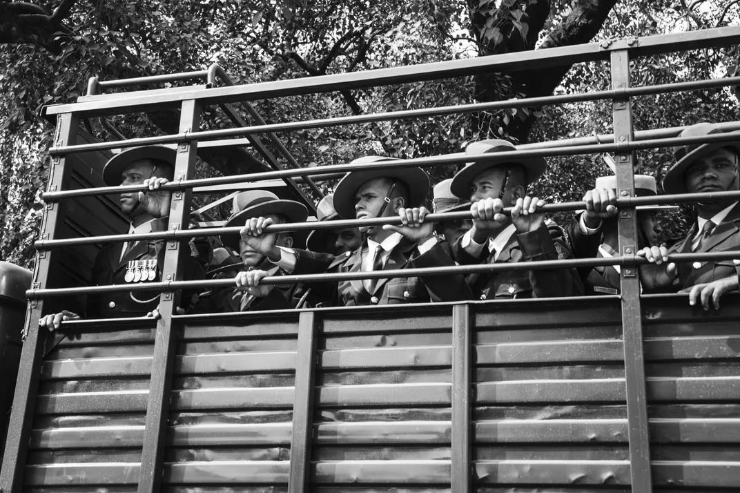 Several Gorkhas in service dress are transported in the back of a truck through Kathmandu traffic.
