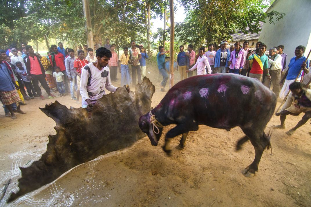 Goru Khota - A tribal festival in rural village of West bengal, India. Villagers prayer in front of Ox or Bull and after that play with them.