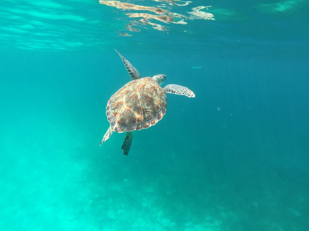 As I was snorkeling in the crystal clear turquoise waters of Turks and Caicos I observed the grace and beauty of this stunning green sea turtle. The natural light from the sun illuminates the natural beauty of this turtle's shell.