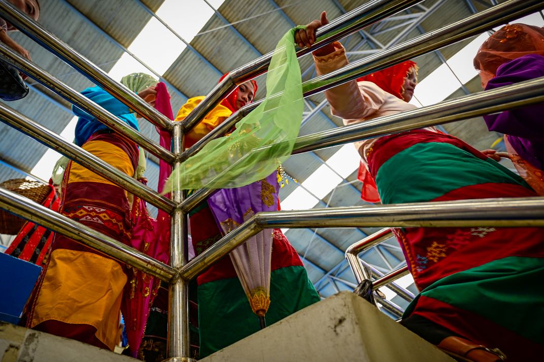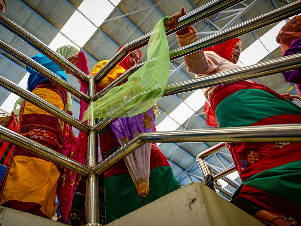 Local cultural dancers gracefully walk down a staircase, a scene we once thought lacked photographic value. This photo was taken during the Bañamos Festival on its intracultural day the afternoon.