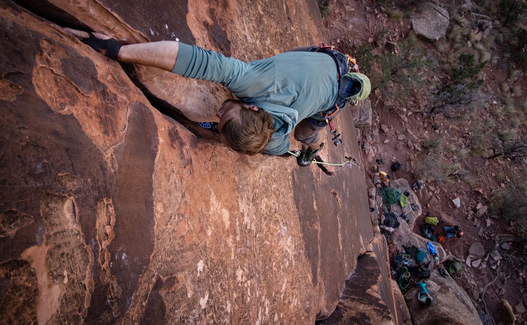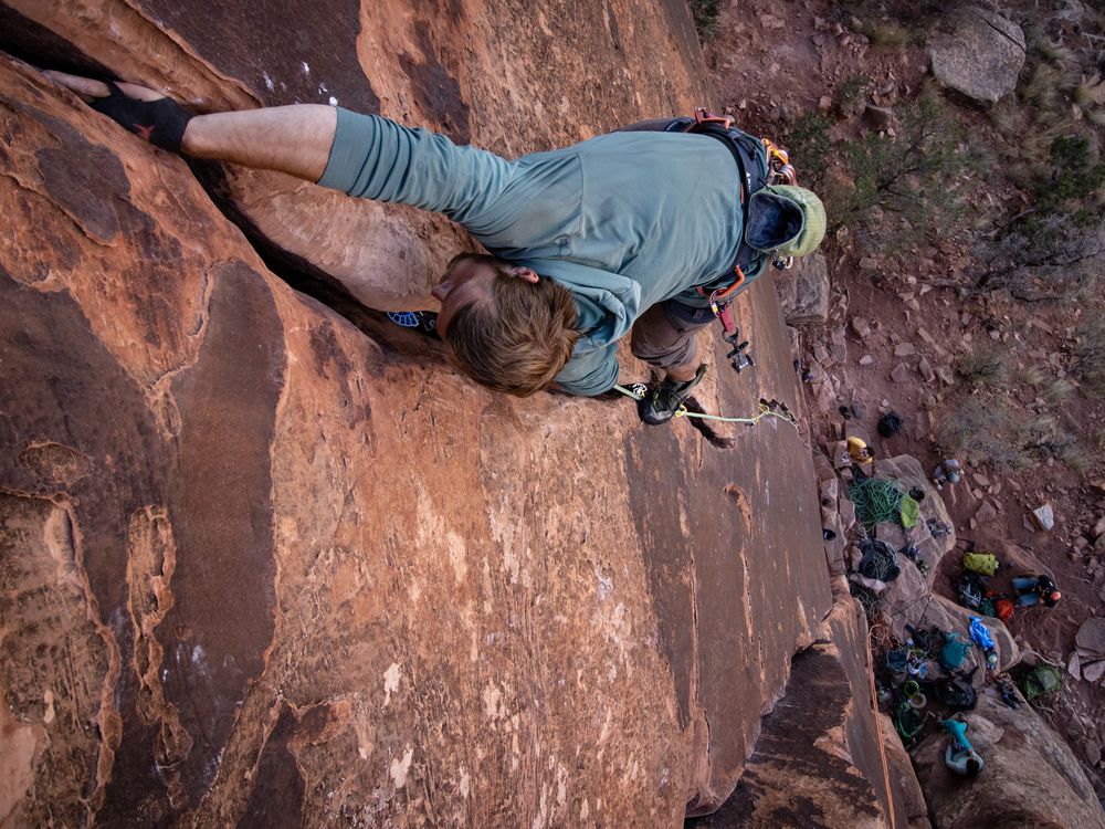 Graham plugs hand jams in to a splitter crack somewhere in Indian Creek. Jack holds his rope, ready for a slip.