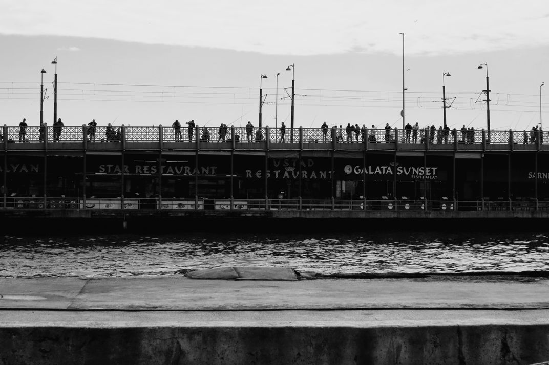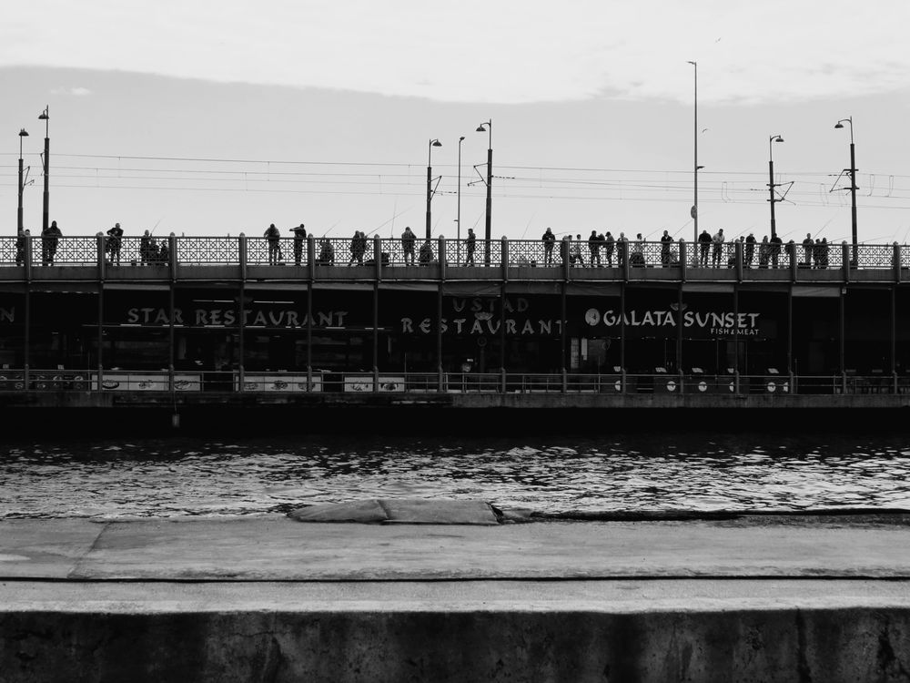 The photo shows the flow of people and the geometry of the Galata Bridge.