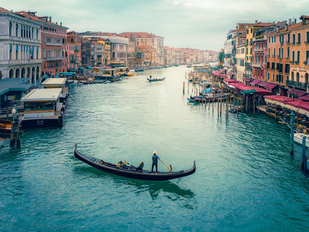 This photo depicts the Grand Canal of Venice from the Rialto Bridge. In the foreground is a gondolier steering his gondola. A second gondola can be seen in the center of the canal, towards the background. The canal flows out of sight as it bends behind the buildings flanking it.
