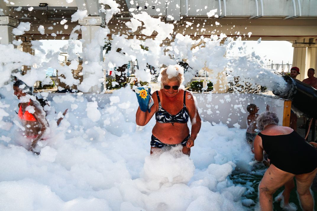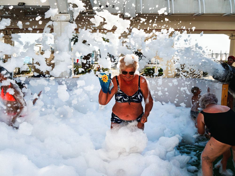 Grandmothers came with their grandchildren to a foam party, but they had fun no less than children.