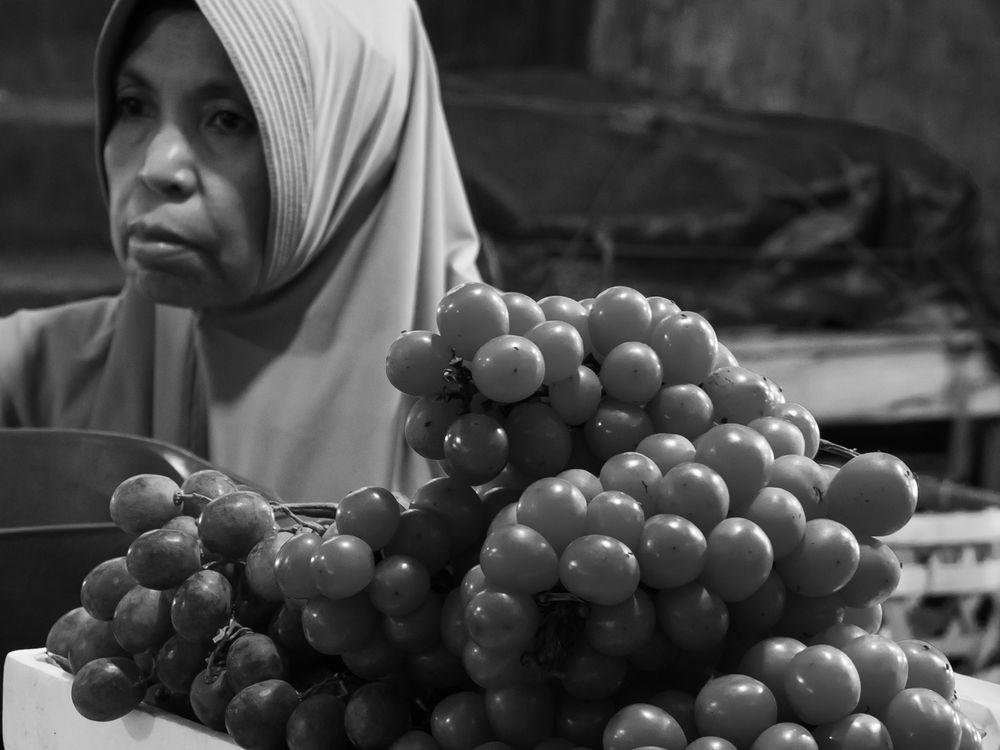 Grapes in the foreground that are sharp and very dimensional are contrasted with the out-of-focus and pensive visage of the vendor.