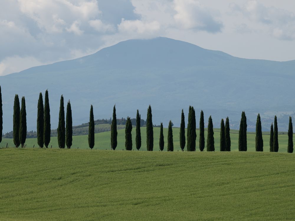 Grass Blanket layered before the cypress of Tuscany with the mountains layered in the background. The beautiful clouds just happened to inspire all of the image...thank you clouds.