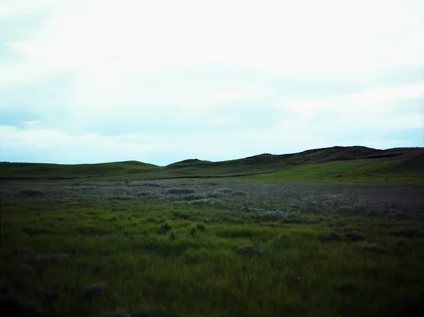Grass plains at midnight in Efri-Vik, Iceland
