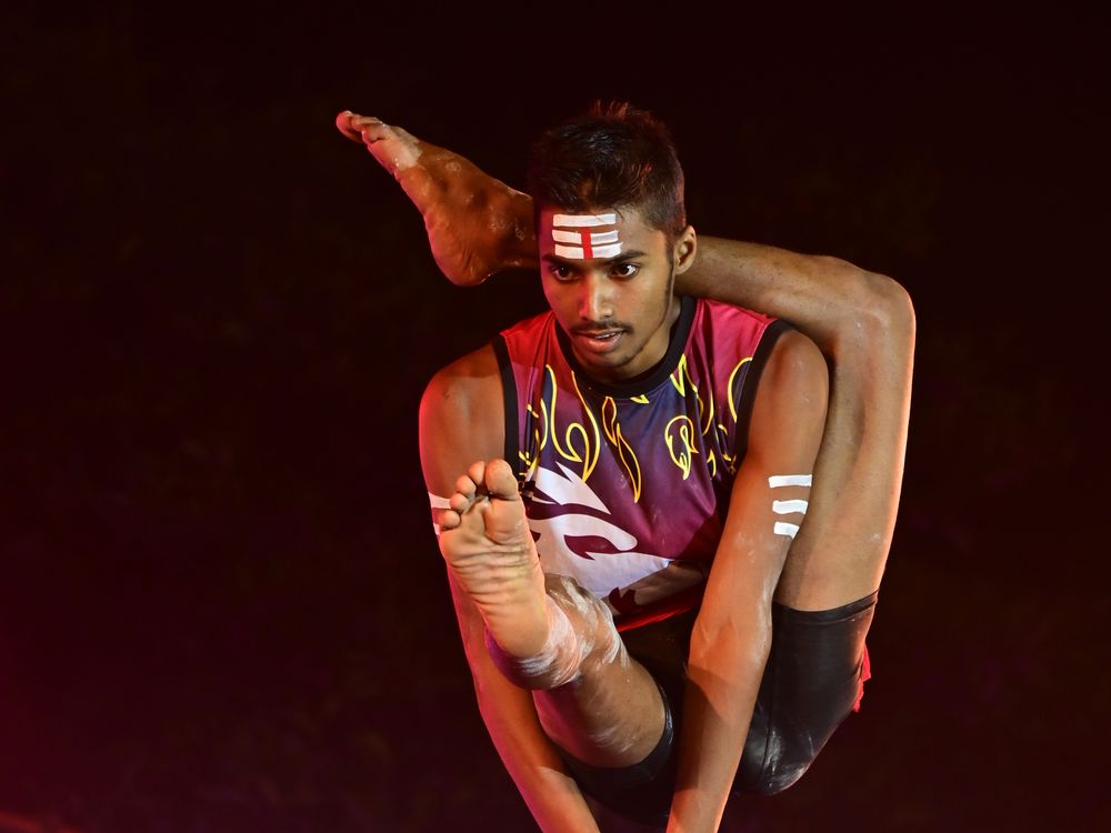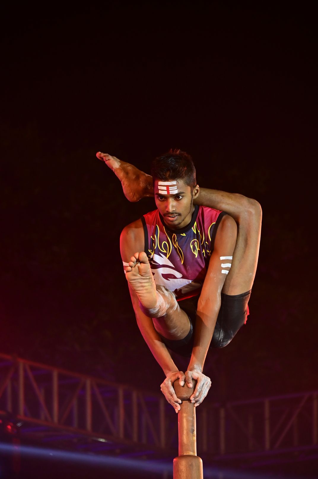 A young Mallakhamb athlete balances with astonishing control, folding his body around the pole with grace and strength. His focused expression and powerful form reveal the discipline behind this ancient Indian sport.
