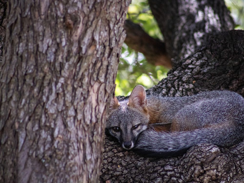 A Gray Fox takes a rest curled up on a limb in a residential area of San Antonio, Texas. This quiet moment shows the surprising adaptability of wildlife in urban environments.
