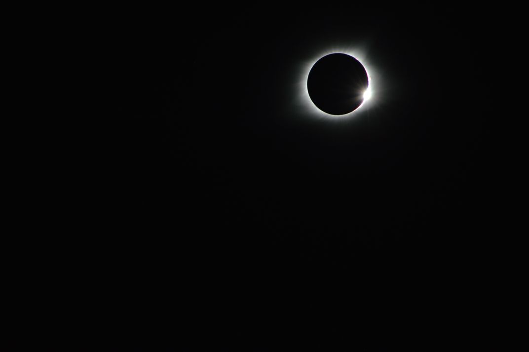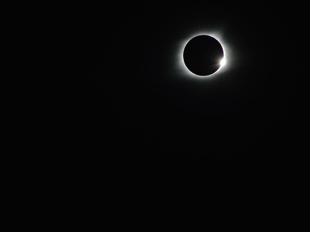 We traveled via train from NJ to St. Louis, MO to see the eclipse. Once in Missouri, using the weather forecast to guide us, we decided to head South to Farmington. Here we observed the totality for a good 2:40 and took this picture just as it ended!