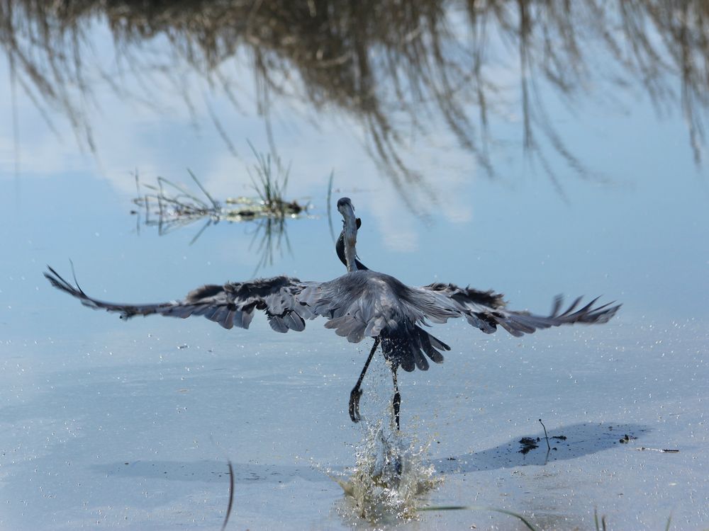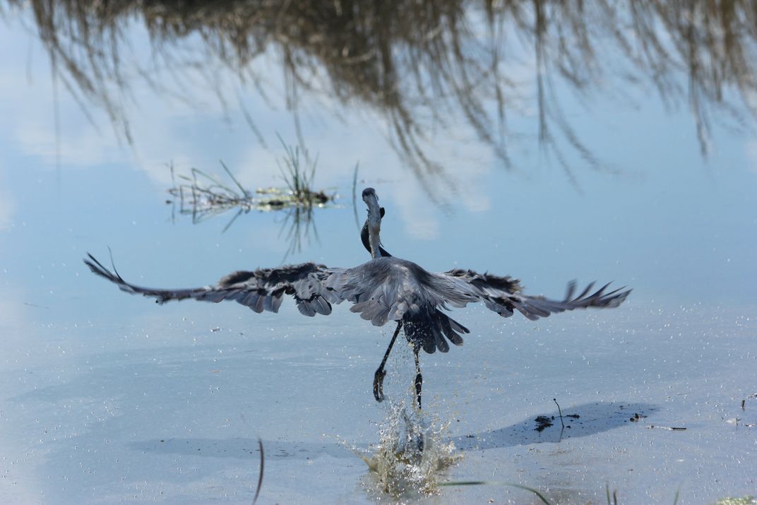Great Blue Heron just caught a Siren Fish and is flying away with it.