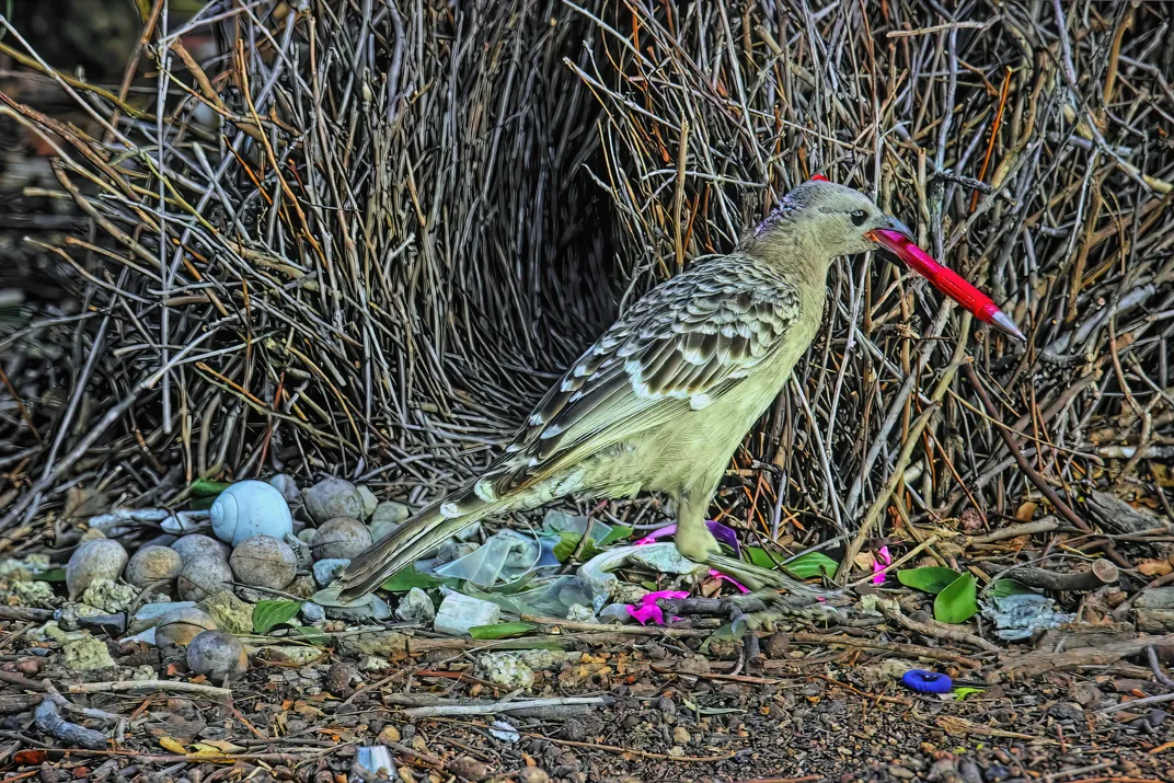 Great Bowerbirds are not uncommon in northen Australia. The males spend a lot of time building an avenue bower whereby twigs are carefully placed in the ground to build an open tunnel. The bower is paved with light coloured objects and a collection of other objects used in their display to the females is placed in one end of the avenue. The male with the best bower and display will win the females. In this case one of the display objects is a red ballpoint pen. I have seen similar objects in several bowers.