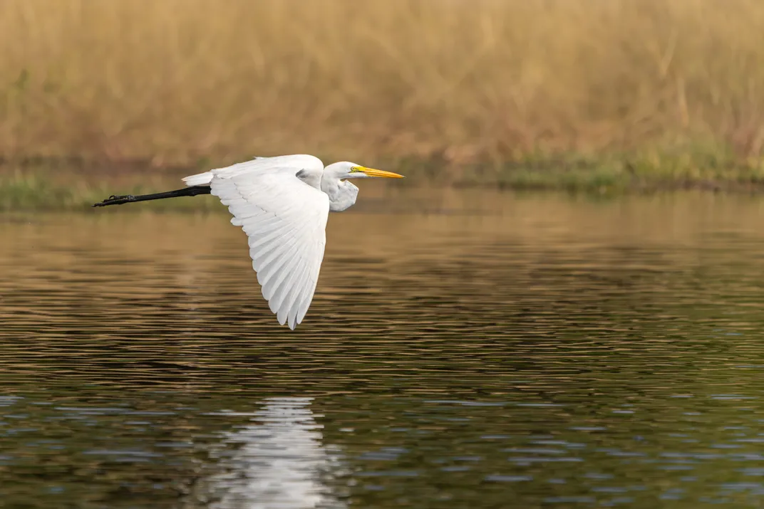 A great egret flies low over the water of the Chobe River, its white wings reflected in the water below.