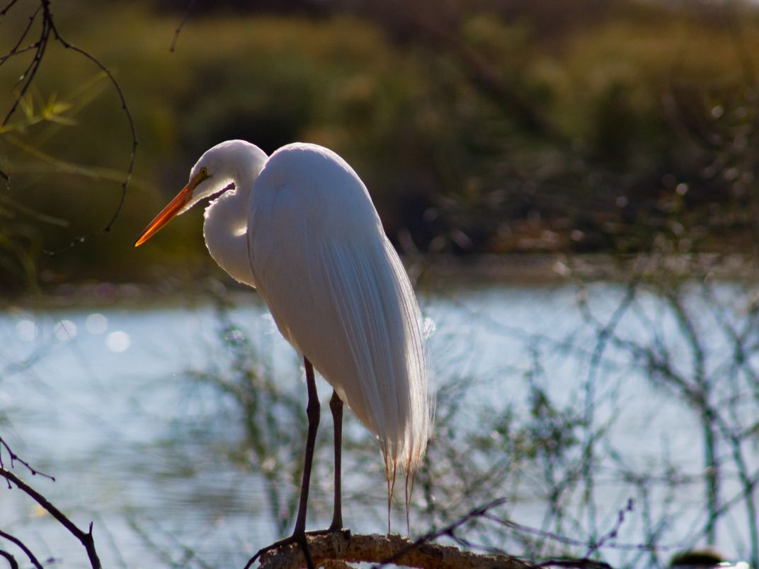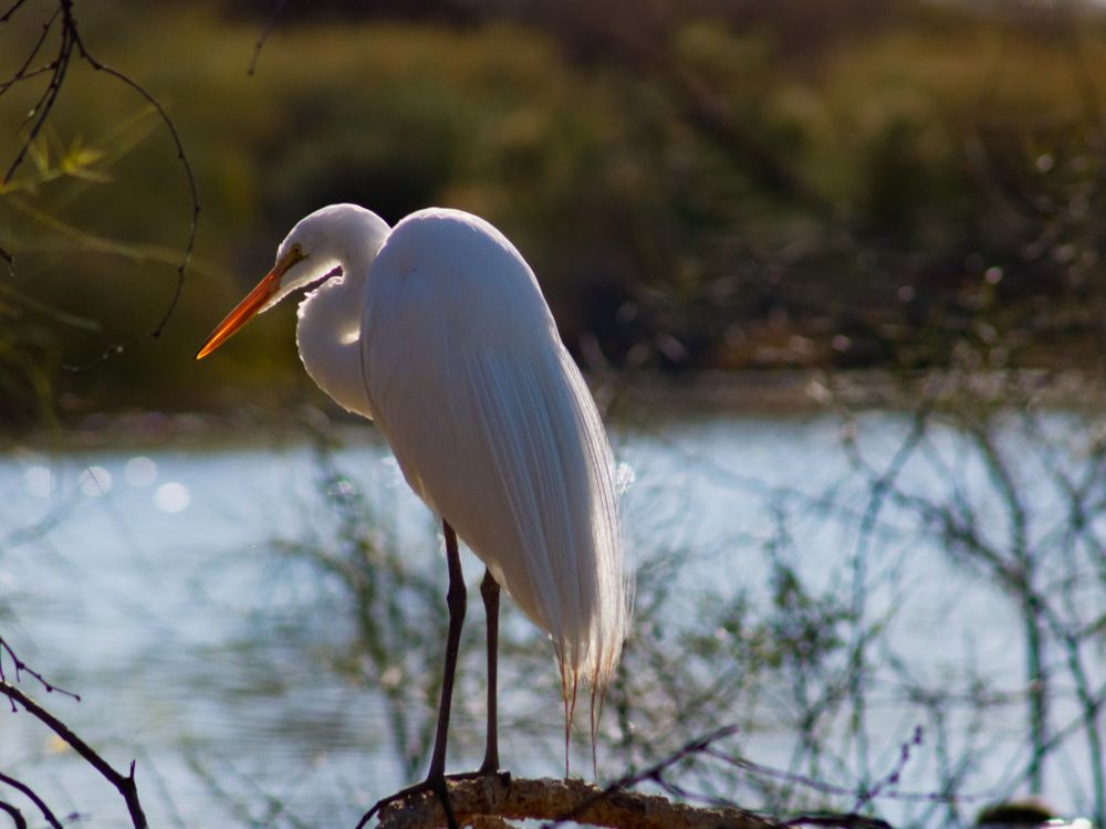 Three Great Egrets sat perched on a branch by the lakeside, this large one stood somewhat apart from the others, making for a clear solo shot. His striking white feathers glowing in the sunlight, and the piercing orange eye staring back at my camera lens made for a stunning composition.