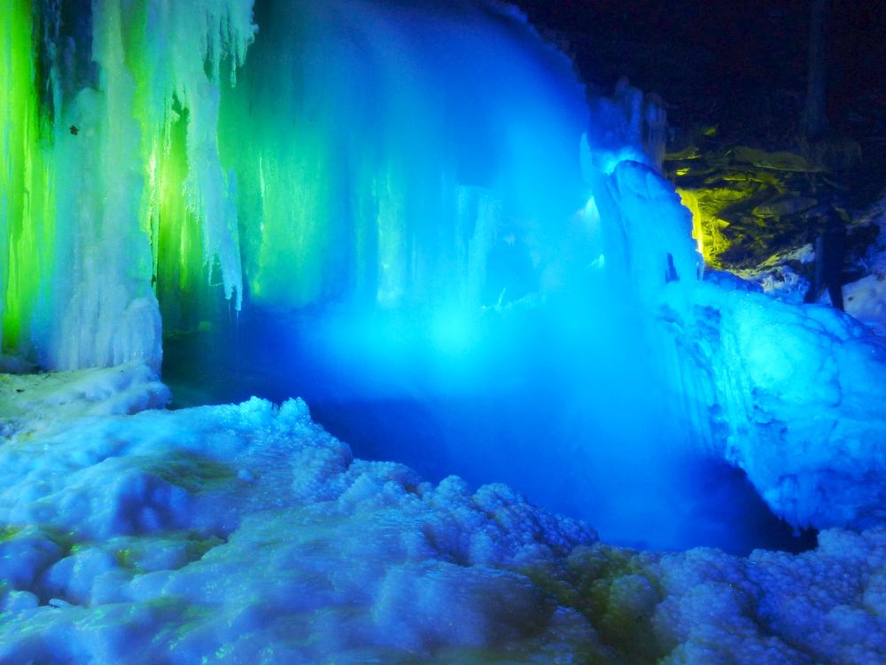 Great Falls Ice Volcano at Night. The www.cityofwaterfalls.ca group lit up Great Falls with colored spotlights in winter from behind and in front with battery powered colored spotlights. The waterfall has formed an ice volcano as the mist freezes.