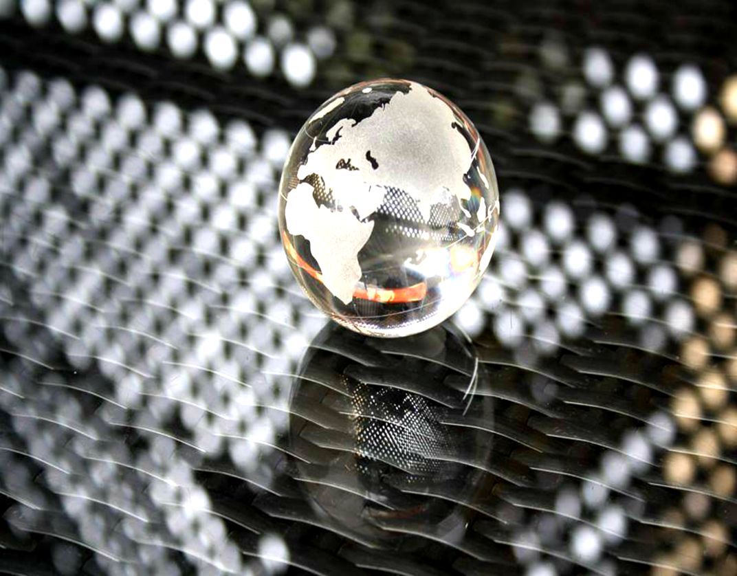 The picture is of a crystal Earth Globe, on a metallic reflecting surface.