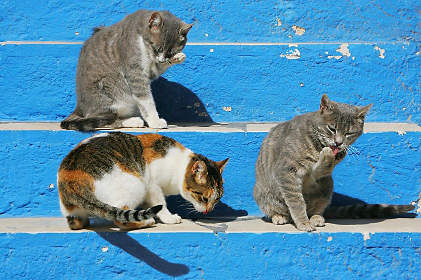 Greek village cats on steps, sunning and cleaning themselves.