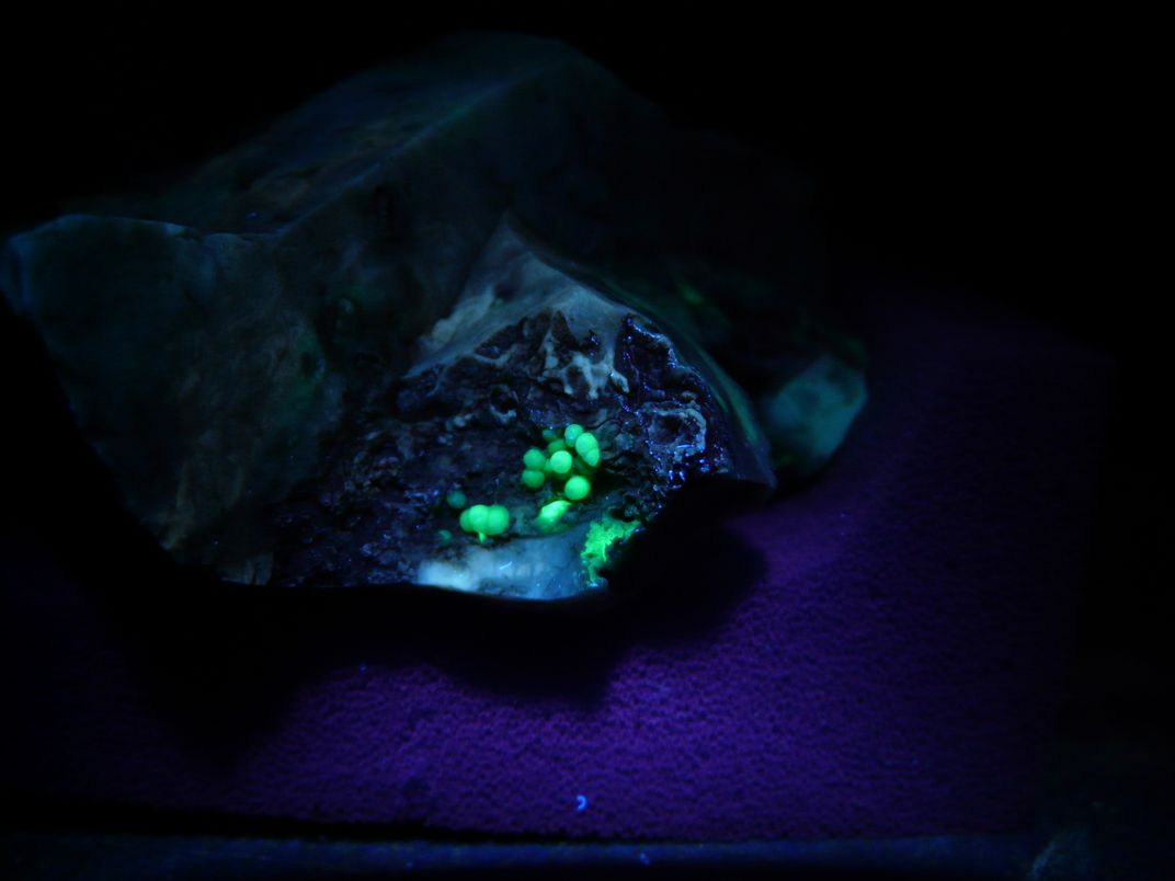 This is a rock called chert. Chert is sedimentary and is composed mostly of microcrystalline silica that are the shells of diatoms millions of years after they died and collected along the bottom of the Atlantic Ocean. Over time they compress, harden, absorb impurities like iron, and often form rock crystal formations and other formations such as these green nodules. In regular light, ie sunlight, room light and other visible light sources the small nodules are greenish in color, while the base rock, the chert, is a pale gray color. Under SW UV light, they floresce a bright green.
