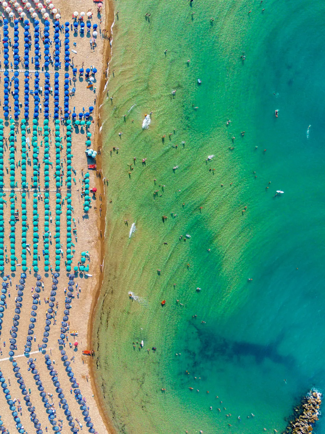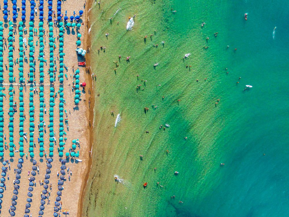 An aerial view of Termoli’s beach, where green umbrellas align with the turquoise water, creating striking geometric patterns along the Adriatic coast.