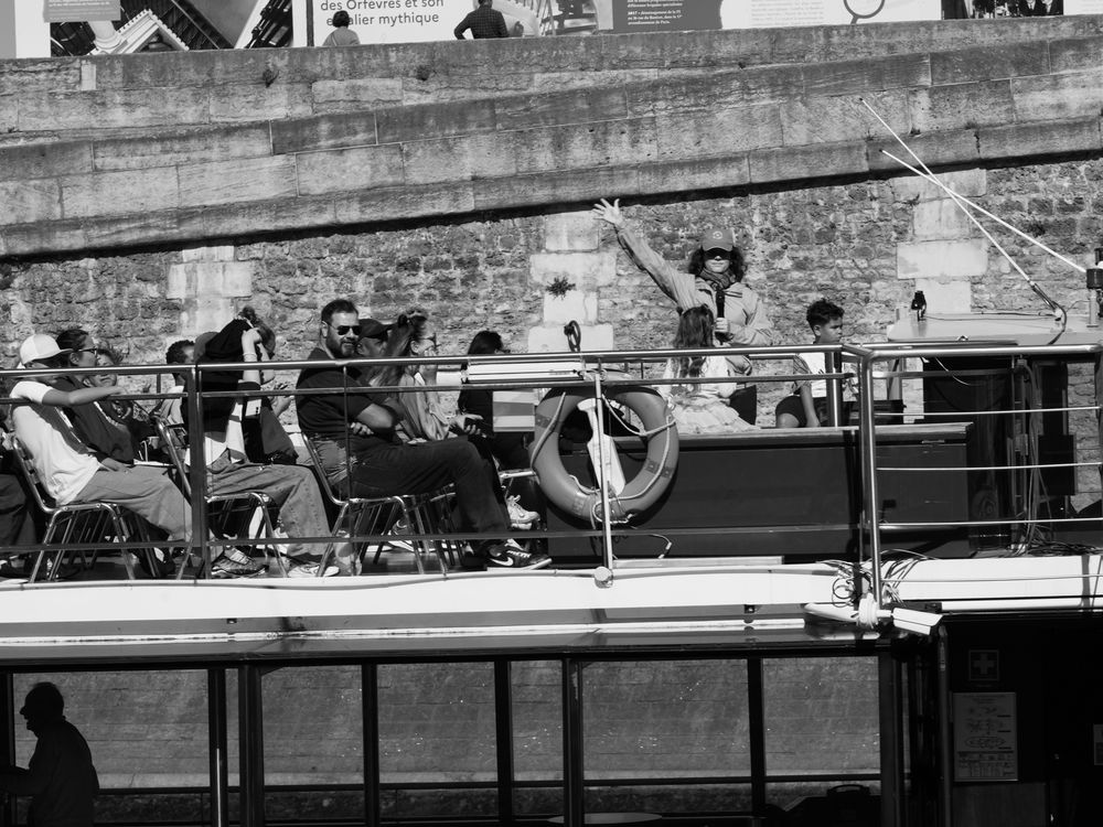 On the Seine in Paris, a boat guide full of tourists returns my enthusiastic wave from the shore, reflecting human connection beyond cultural boundaries and celebrating shared joy.