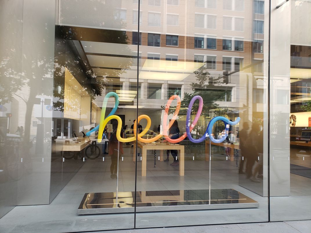 A colorful statue with the greeting "Hello" inside an Apple Store at Boston, MA.