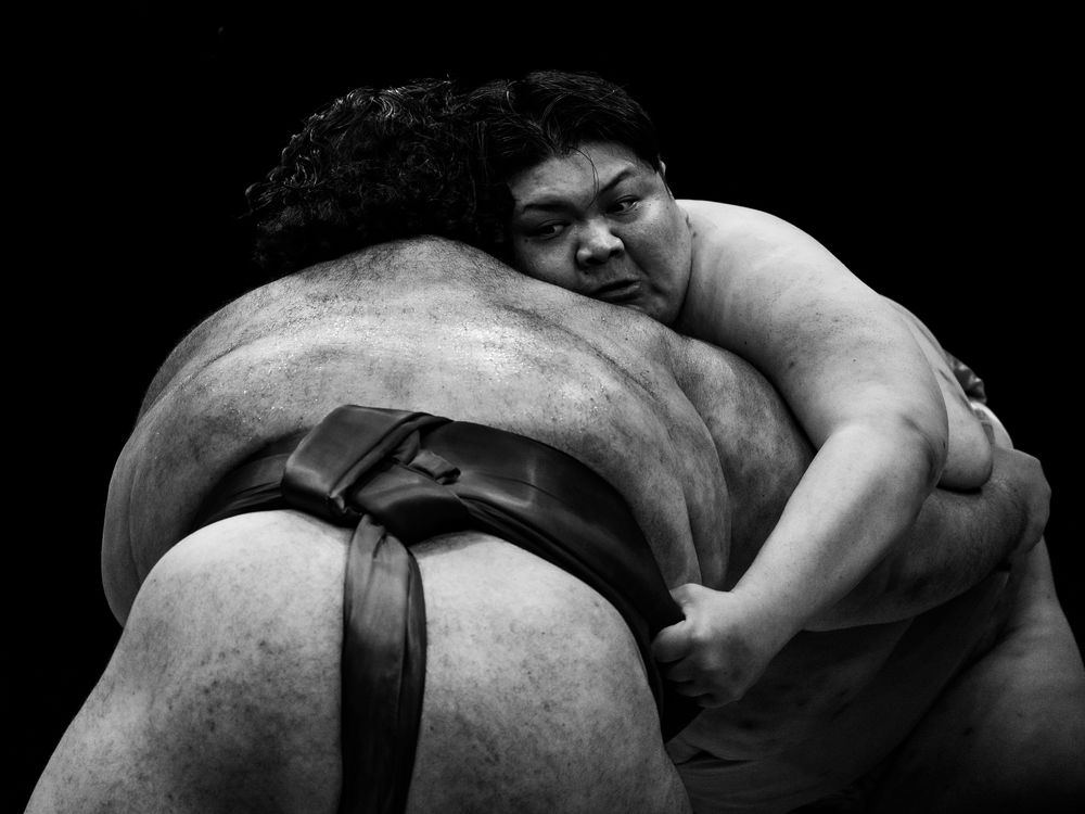 Two sumo wrestlers lock in an intense embrace, their strength and strategy merging into a single moment of stillness before impact. Sweat glistens on their skin under the light, the black background isolating their struggle — a raw, timeless portrait of discipline, endurance, and human connection.