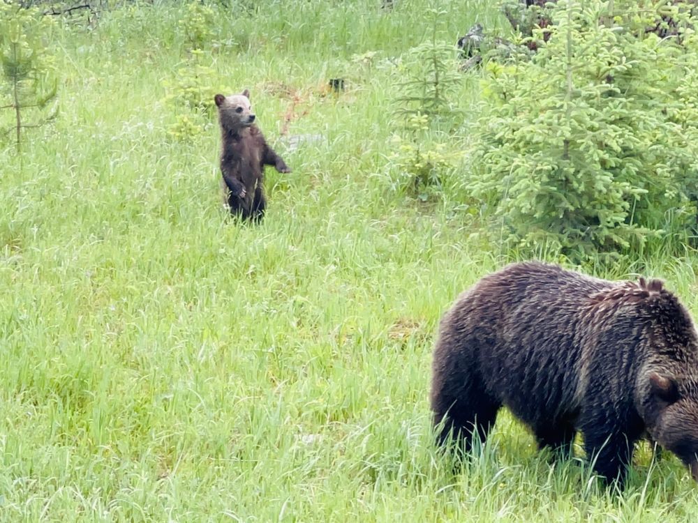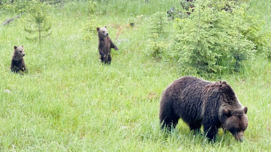 A mother grizzly and her two cubs explore a meadow in Banff National Park, Canada. The cubs linger curiously in the tall grass—one even rising onto its hind legs—while their mother grazes calmly nearby. Scenes like this highlight the wild, untouched beauty of Banff and the importance of giving wildlife the space they need to thrive.