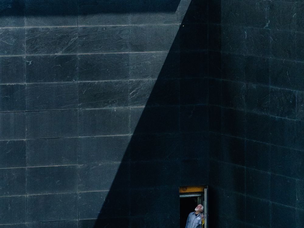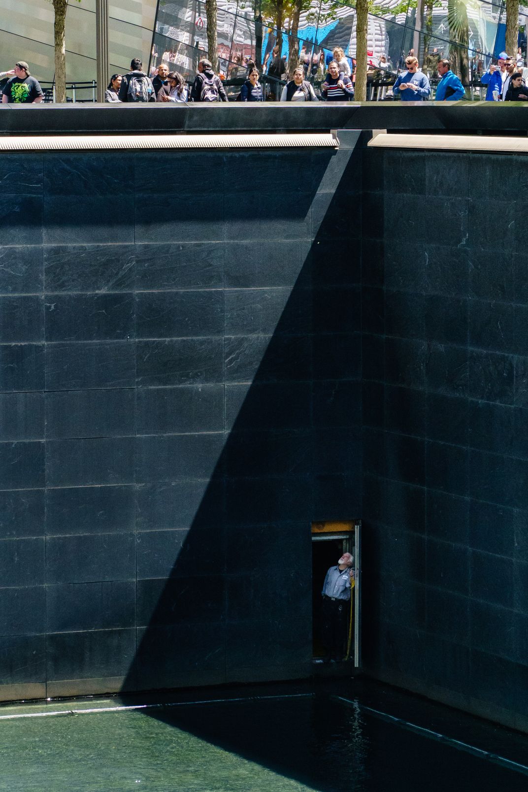 The footprints of the fallen Twin Towers have become a memorial. It has since become a major tourist attraction in lower Manhattan. A worker observes the tourists from below.