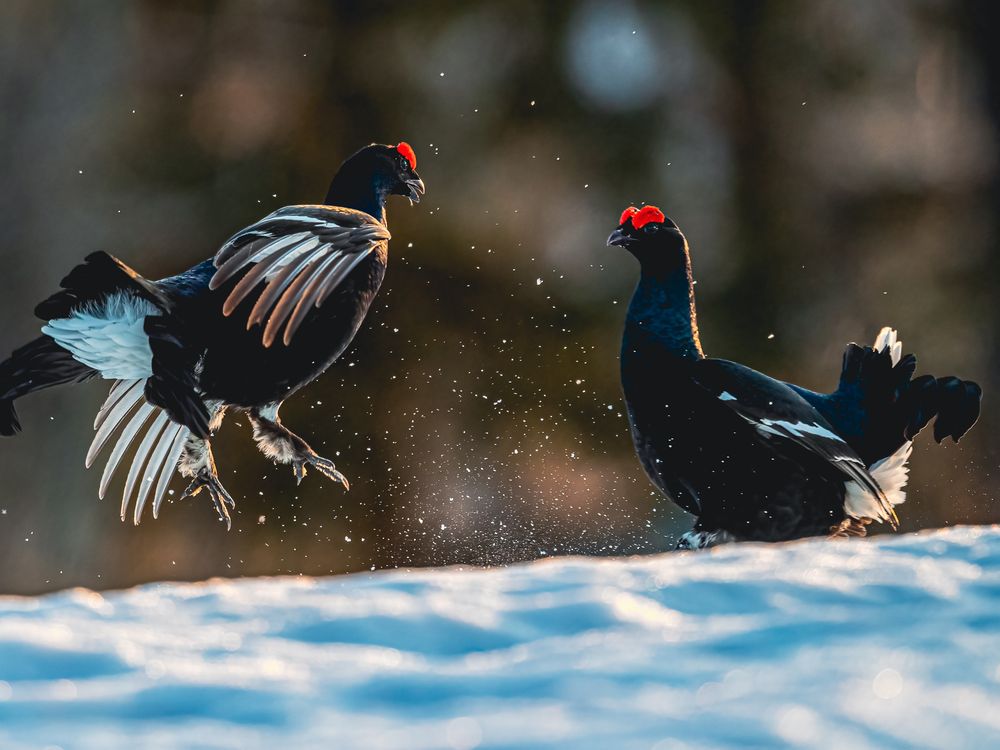 Black Grouses use to gather on a rural hay field for their spring display fights. The location is situated close to my holiday cottage, about 10 km from the Russian border. This time the field was covered by snow. I had to go into hiding in a dedicated photography booth before the sunrise. After an hour of waiting Black Grouses started to appear. And fights started immediately. The photography session lasted until 09:00 am or so. The spectacle started shortly before the sunrise at around 03:30 am. Here two male birds are in the midst of their struggle.