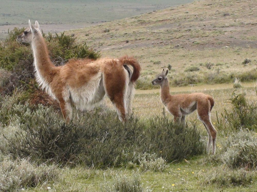 Otra foto obtenida a orillas del camino en las Torres del Paine, nos encontramos con una familia de guanaco, donde la cría conocido como chulengo, sigue a su madre.