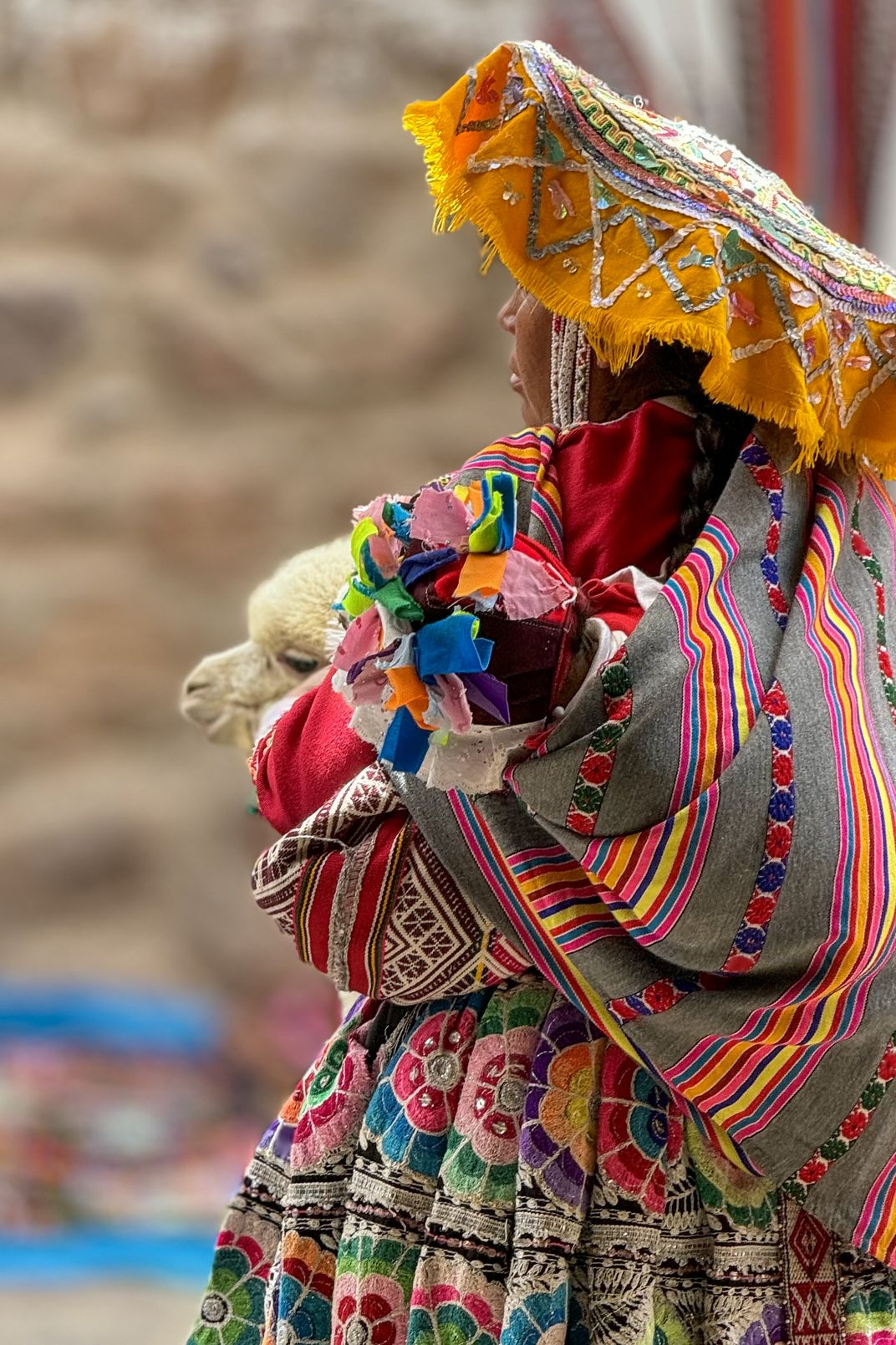 In the streets of Cusco, Peru, a Quechua woman stands wrapped in the traditional colors of the Andes, carrying a young alpaca in her hand-woven manta. Her clothing reflects centuries of textile artistry passed from mother to daughter — each pattern a symbol of identity, resilience, and connection to the mountains. The moment captures quiet pride and continuity amid a rapidly changing world.