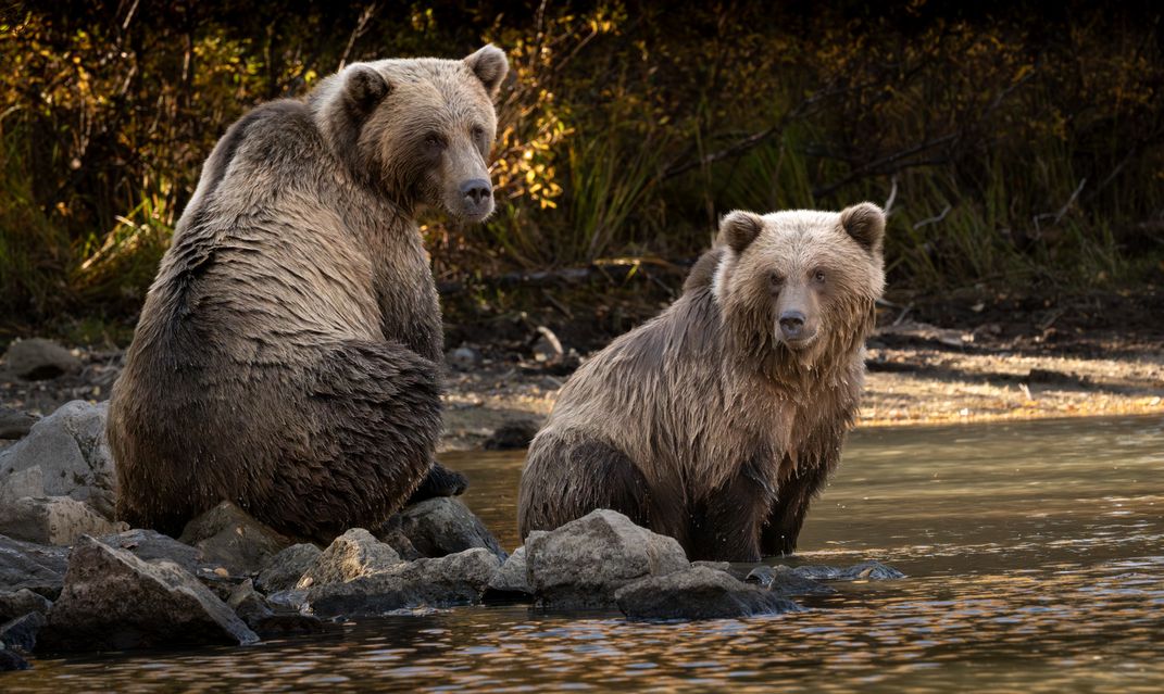 Two bears rest at the water’s edge in Lake Clark National Park, their fur damp and golden in the soft light, calmly surveying the quiet Alaskan wilderness around them.