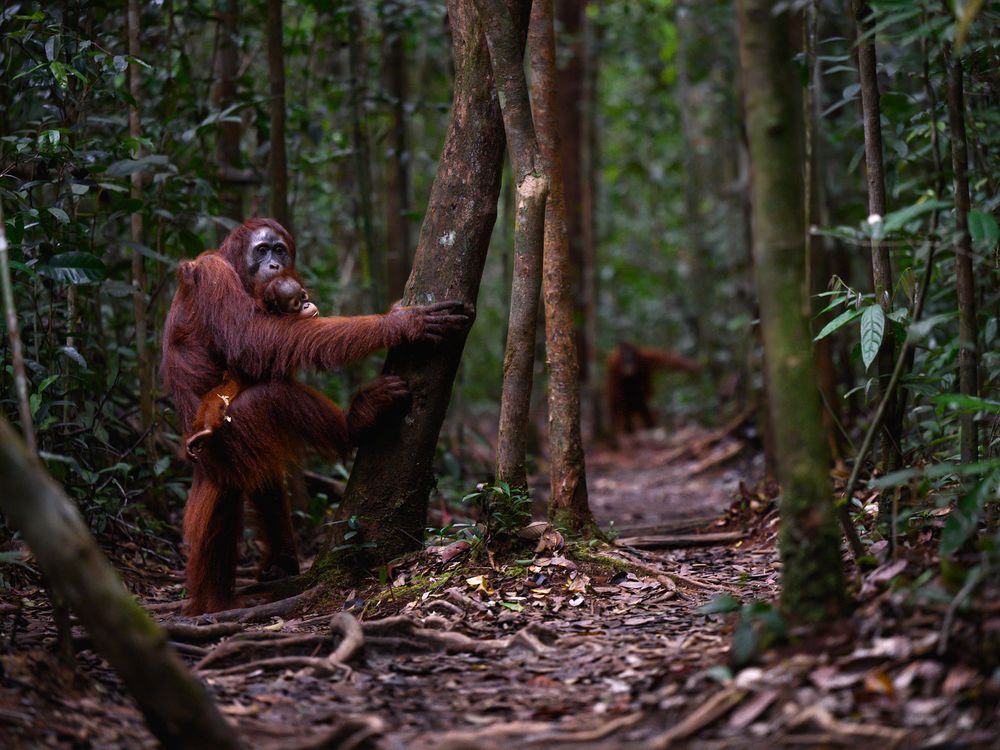 A mother holds steady, her baby clinging close, while a silent figure watches from the forest beyond.