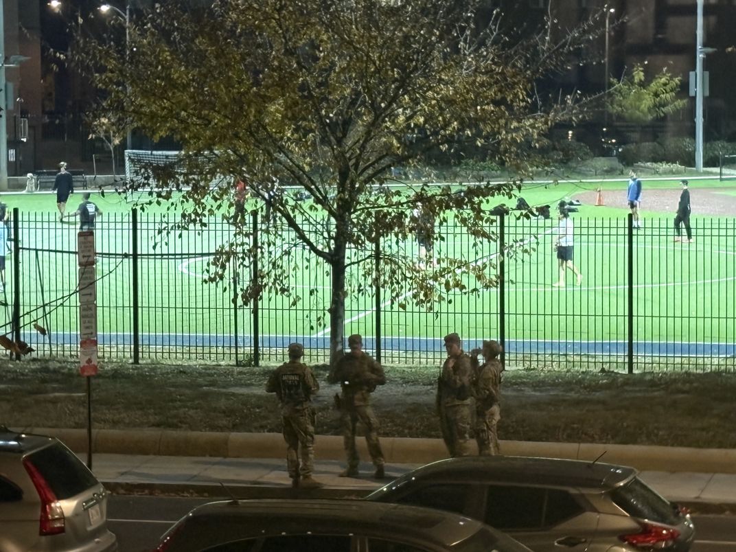 National Guard troops in Washington, DC standing outside watching a nighttime game of soccer
