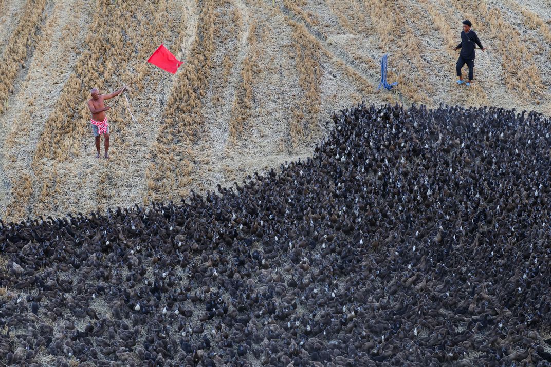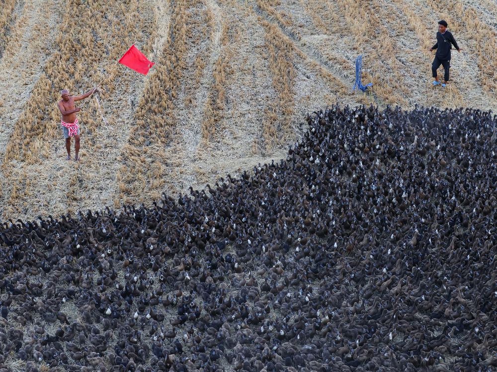 Farmers guide hundreds of ducks across a harvested rice field. The ducks feed on leftover grains and pests, helping to prepare the land for the next planting season. This photo shows the cooperation between people and animals in sustainable farming practices and also win to win situation beyond the harvest.