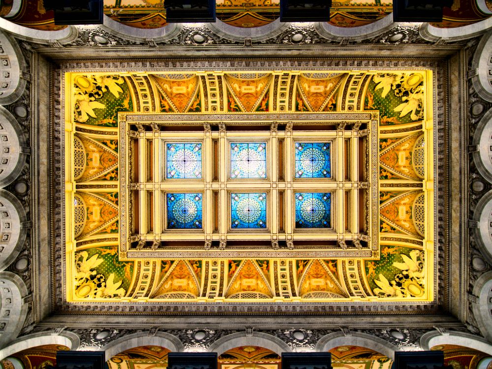 In this photo you can see the guilted ceiling of the Library of Congress of Washington D.C.