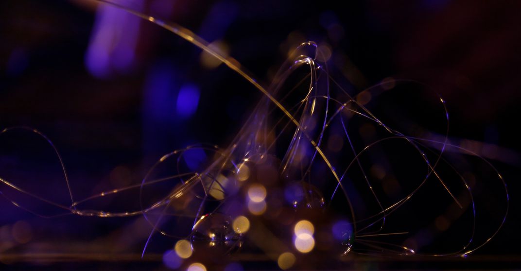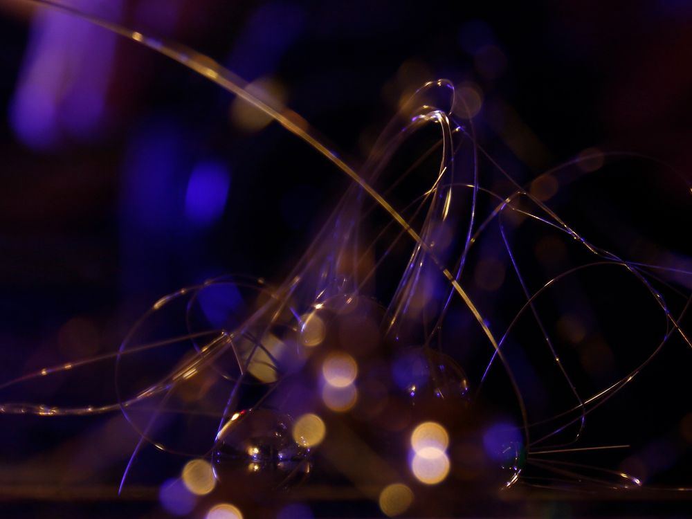 This photograph is a tangle of used guitar strings (E, B and G) and three ball bearings. I put the arrangement on some mirrors, put in blue and red light bulbs and did manual focus.
