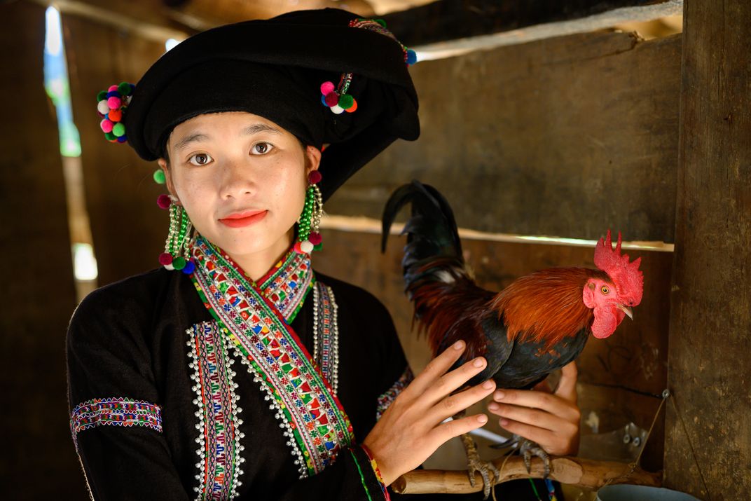 "I raised this rooster to catch wild roosters in the forest" Hac explains. She wears the traditional clothes of the Lao ethnic group, one of the 54 officially recognized ethnic groups of Vietnam.