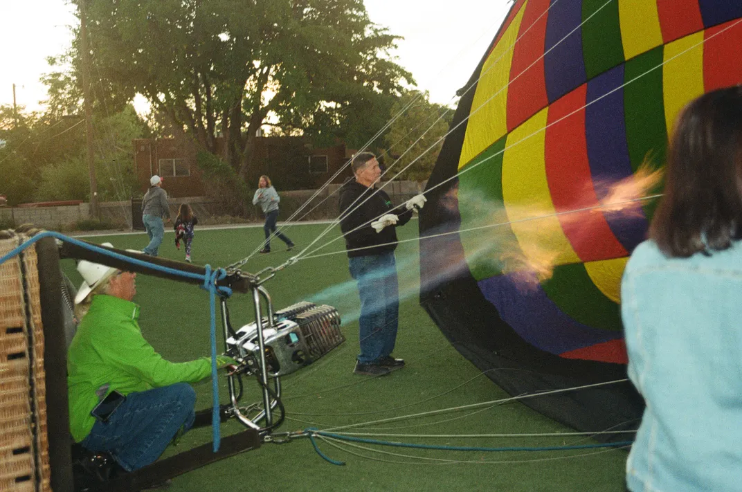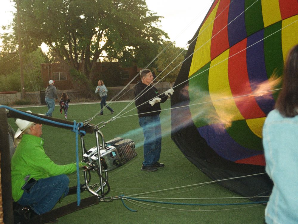 This photo was taken at an elementary school exhibition about balloons. The balloon is demonstrated being heated on the ground until it has enough heated air so that it can lift off. A lady unexpectedly walked in the line of the photo and it looks as if her hair is on fire.