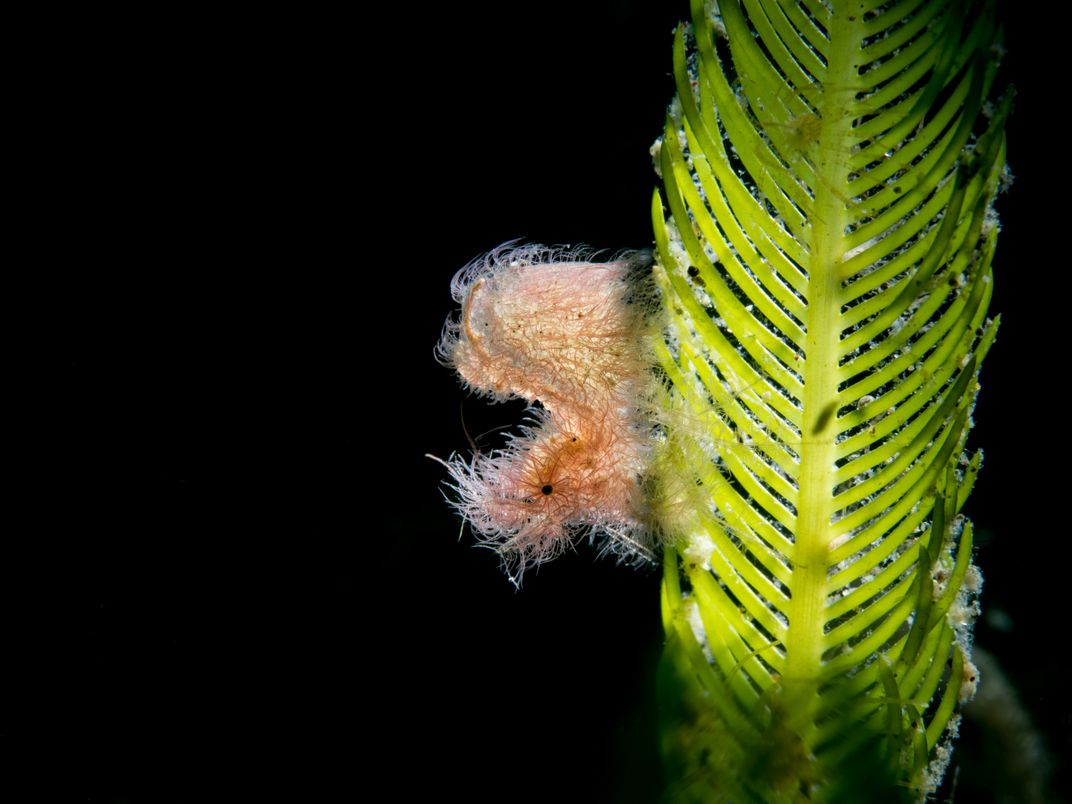 The Hairy Shrimp (phycocaris simulans) is also called Algae Shrimp. They grow up to 5 mm in size (often smaller) and sit in between Algae or on rocks and rubble or in between tunicates and ascidians. They can be white, brown, red, yellow or even sometimes greenish and perfect their camouflage with their hairy outgrowth. The tail of the Hairy Shrimp stands high up and gives him a swan-like profile.